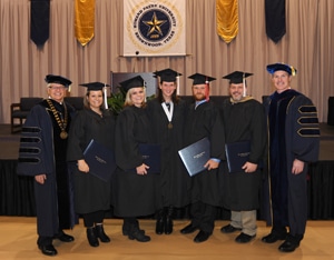 Cutline: Recent graduates from HPU’s New Braunfels Center are pictured with university administration and faculty. Left to right: Dr. Bill Ellis, HPU president; Ashley Greene; Glenda Brownlow; Francene Larrabee; Justin Hall; Darryl Fresne; and Dr. Dale Meinecke, assistant vice president for external affairs and assistant professor of Christian studies. Not pictured are Elizabeth Kensing, Jolind Tavs and Courtney Wilder.