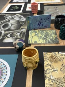 The display features work from the Contemporary Crafts, Ceramics I, Drawing I and Drawing II courses held during the 2025-2026 academic year. The Crafts students’ work features linoleum block prints, handmade books and weaving. Ceramics projects were created in a variety of construction methods such as coil, slab and pinch pot. Drawings on display were made in graphite, ink, charcoal, colored pencils and chalk pastels.