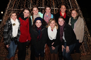 Photo cutline: HPU students celebrate Christmas on the Plaza festivities. Gathered around the Christmas lights are (back row, from left) Jaclyn Bonner, Caitlin Wood, Bailey Waller, Nicole Hamilton, Jenna Underwood and Mason Samsel. Students in the front row, from left, are Hannah Williamson, Emily Selman and Olivia Belsher.