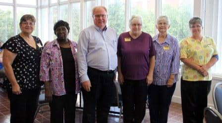 Photo cutline: Five employees of Sodexo, HPU’s food service provider, were recently honored for 25 years of service. Left to right: Roseanna Stone, Paulette Henderson, Don Green (general manager), Wanda Gibbs, Margie Coker and Lyndia Collier.