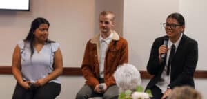 Cutline #2: During a panel discussion at the Legacy Luncheon, students share how their HPU experience has been impacted by scholarships. Pictured are, from left, Mariah Garcia, Payton Chumbley and Patricia GaribayBartolo.