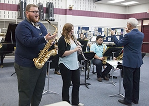 Cutline: HPU’s Jazz Ensemble will present a spring concert on Thursday, March 9. Pictured are two of the concert’s soloists, junior Alex Atkinson (left) and sophomore Katelyn Zimmer (center), and the ensemble’s director, Stephen Goacher, professor of music (far right).