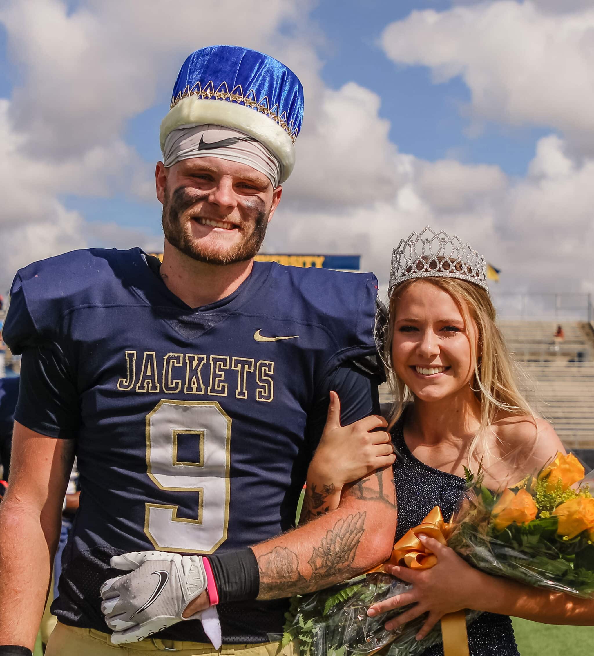 A football player from Howard Payne University and a young woman wearing a yellow dress and tiara, both with crowns, smiling on a sunny day at a stadium. | HPUAlso honored at halftime were HPU’s 2021 alumni honorees: Tim Viertel ’80, Distinguished Alumnus; Cindy (Hughes) Liebrum ’72, Coming Home Queen; Bridget (Wells) Jones ’08, Outstanding Young Graduate; Terry ’91 and Robin (Quinn) Chumbley ’91, Grand Marshals; Dr. Bill Taylor ’64, Medal of Service; Rev. Ben Delgado ’68, Dr. José Rivas Distinguished Service Award.