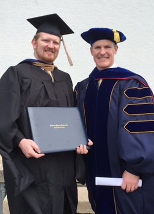 Cutlines: John Kublank, left, recently graduated from HPU’s New Braunfels Center with a Master of Business Administration degree. He is pictured following the Commencement ceremony with Dr. Dale Meinecke, HPU’s assistant vice president for external affairs and assistant professor of Christian studies.