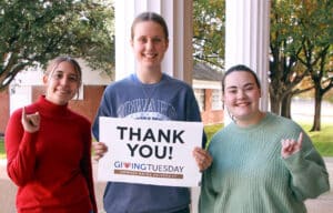 Cutline: HPU students Nicole de la Houssaye, Julie Ivy and Madison King (pictured from left) express their appreciation to all those who supported the university on GivingTuesday. Showing their HPU spirit, de la Houssaye and King display the HPU Yellow Jackets’ “Sting ’em” sign.