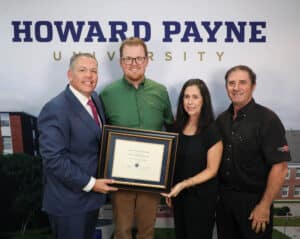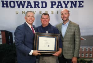 BROWNWOOD – April 29, 2025 – Howard Payne University recently recognized members of faculty and staff at an annual personnel luncheon held on campus. Dr. Chris Rosborough, associate professor of music, director of choral activities and department chair, received the Outstanding Faculty Member Award. Aaron Diaz, grounds supervisor, received the Outstanding Staff Member Award. The outstanding faculty and staff awards are made possible by Underwood’s Cafeteria and Porter/BKCW Insurance Agency, respectively.
