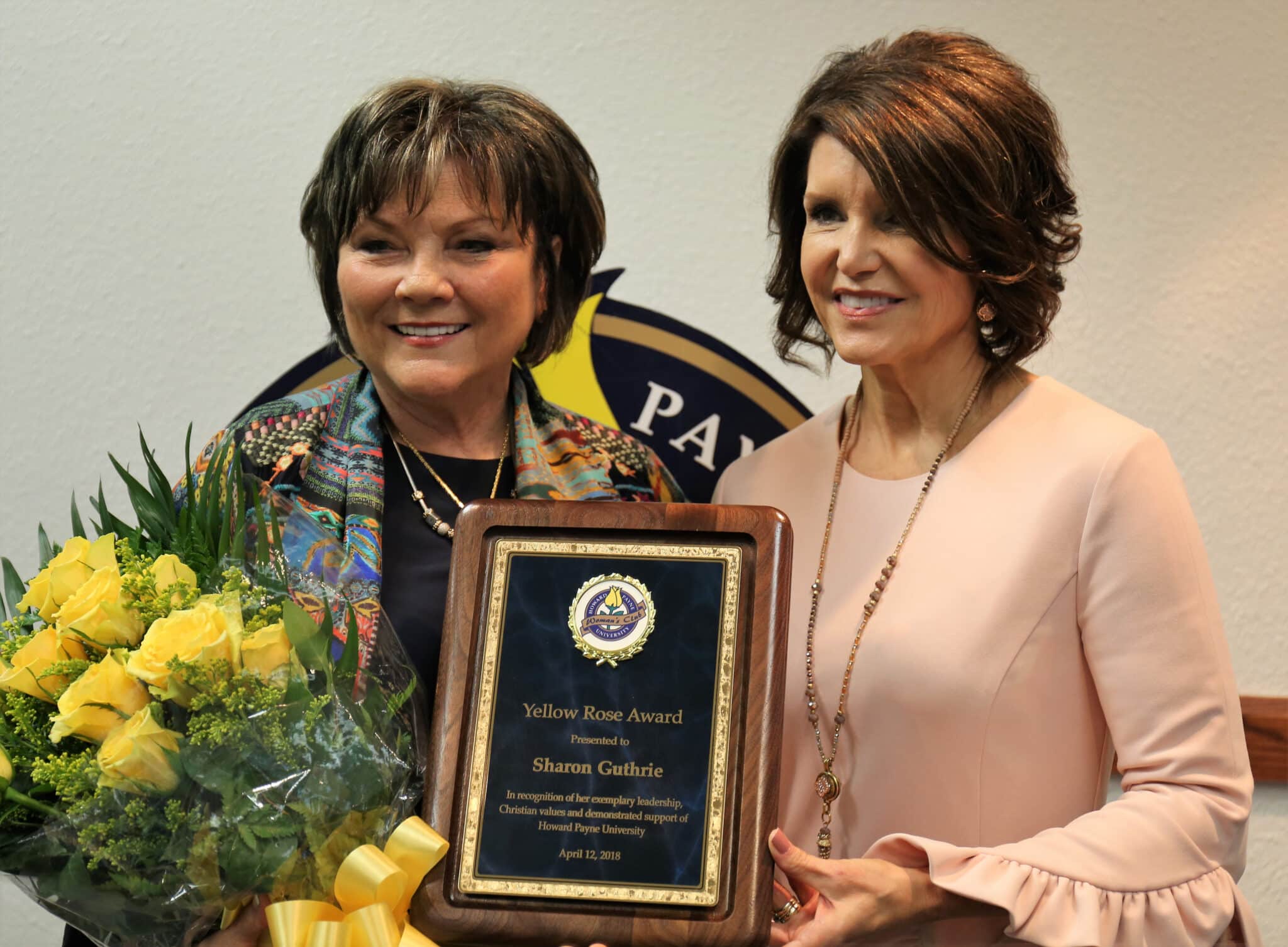 BROWNWOOD – May 3, 2018 – The Howard Payne University Woman’s Club presented the prestigious Yellow Rose Award to Sharon Mitchell Guthrie of Stephenville during the club’s annual Yellow Rose Scholarship Luncheon held recently on campus.