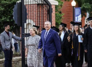 Cutline 1: HPU President and First Lady, Dr. Cory and Melinda Hines, lead HPU graduates in annual Chime Out tradition through the Wilson Gate.