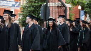 Cutline 2: HPU graduates proceed through the Wilson Gate as a part of HPU’s Chime Out tradition.