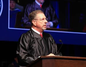 Cutline 3: HPU alumnus Tim Viertel ’80, author and retired U.S. Secret Service deputy assistant director, presented a charge to the graduates during both Commencement ceremonies.