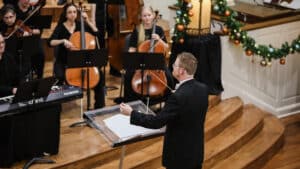 Cutline 2: Dr. Chris Rosborough, associate professor of music, director of choral activities and chair of the Department of Music, conducts HPU’s Christmas concert.