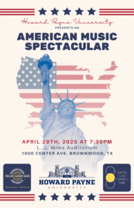 BROWNWOOD – April 25, 2025 – The HPU Symphonic Band and the Central Texas Community Band are joining forces to present the annual American Music Spectacular concert Tuesday, April 29. The concert will take place at 7:30 p.m. in Mims Auditorium on the HPU campus. Admission is free and open to the public.
