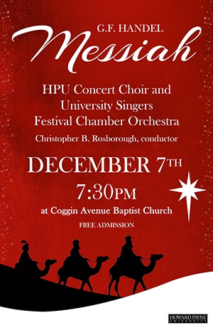 MessiahPosterBROWNWOOD – November 30, 2017 – The University Singers and Concert Choir of Howard Payne University will present a Christmas Concert Thursday, December 7, at 7:30 p.m. at Coggin Avenue Baptist Church in Brownwood. The program is free of charge and open to the public.