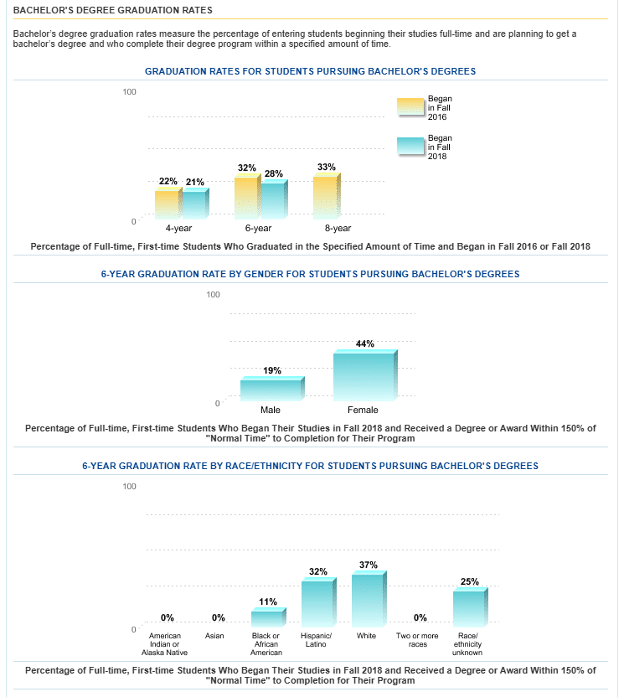IPEDS data is illustrated below by articulating various graduation rates for First-Time Full-Time students pursuing bachelor’s degrees, including visuals of male and female graduates as well as graduation rates by race/ethnicity beginning in Fall 2016 and Fall 2018. (Click to view larger image).Â